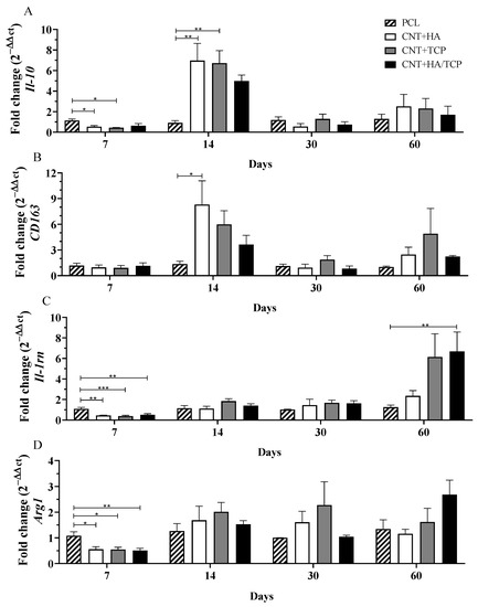 The CNT+HA group presented CD163 gene expression 8-fold change higher than the PCL on the 14th day (Figure 3B), followed by CNT+TCP (6-fold change) and CNT+HA/TCP (4-fold change). After 30 and 60 days, no important difference was observed among the groups. Regarding Il-1rn (Figure 3C), it is possible to notice that all three of the composite groups presented significantly reduced gene expression compared to the PCL one. On the 14th and 30th days, all four groups presented reduced and similar expression, but on the 60th, the CNT+HA/TCP group present statistical difference to the PCL one (7-fold change), followed by the CNT+TCP (6-fold change) and the CNT+HA groups (2-fold change), respectively. Arginase 1 (Arg1) is a M2a surface marker and its results revealed that after 7 days (Figure 3D), similar to Il-1rn, all three composite groups presented significantly reduced gene expression compared to PCL. On the 14th and 30th days, all four groups presented similar expression. On the 60th day, only the CNT+HA/TCP showed higher gene expression when compared to the PCL group, with, approximately, a 2.5-fold change, but with no evidence of difference.