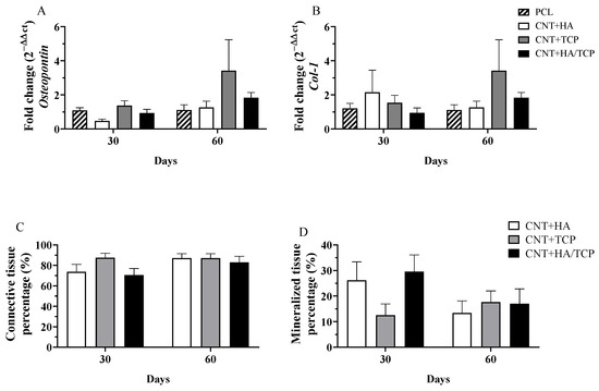Tissue maturation and mineralization is an essential physiological process to regenerate bone tissue, and its absence could result in impaired tissue recovery. Figure 4A,B show the results for osteopontin (OPN) and collagen I gene expression, respectively, over the experimental period. No evidence of statistical difference was found. However, higher OPN and collagen I expression in the CNT+TCP (3-fold change) and CNT+HA/TCP (1.5-fold change) groups than the PCL one was observed after 60 days. The histological evaluation shows the percentage of connective and mineralized tissue observed in the groups (Figure 4C,D). There was no difference in connective tissue formation, since all groups had similar production after 30 and 60 days. However, on the 30th day, the CNT+HA and CNT+HA/TCP groups showed higher percentages of mineralized tissue compared to the CNT+TCP one. On the 60th day, a slightly difference was observed between the CNT+TCP and CNT+HA/TCP groups compared to the CNT+HA one.