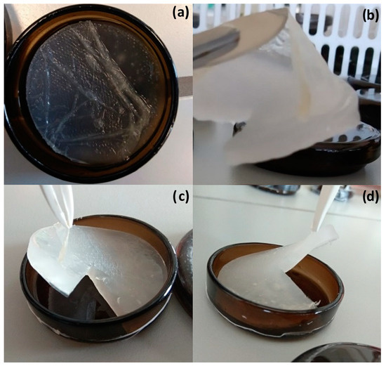 Hydrogels and dressings made in this study were designed to be part of soft matter materials. Mechanical properties of wound dressing materials should ensure that they will adapt to the wound bed topography and contour, will not disintegrate, and will not cause discomfort (for example, due to their stiffness) during usage. PVA is an attractive candidate for many applications in regenerative tissue medicine as it can mimic a wide range of soft tissues [43,47,48,49,50]. The hardness of the PVAIRR gels obtained in this work was measured using a Shore durometer on the A scale (Table 3). Gels before e-beam treatment were too soft to measure them reliably; thus, these results are not presented.