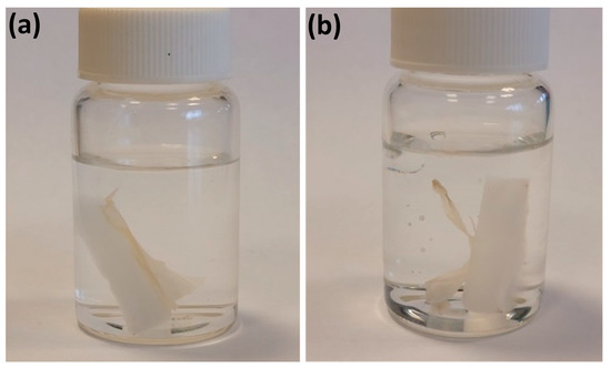 A picture of the laminar dressing immersed in water for 24 h: (a) samples with 50% of GA and irradiation applied, (b) samples with 10% of GA and irradiation applied.