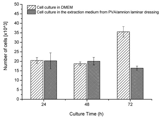 Fibroblasts were able to grow for 24 and 48 h of culture in the presence of extract of PVA/amnion laminar material. No exponential cell growth in extract was visible between 48 and 72 h, and additionally a decrease in the number of cells in comparison to the DMEM control was observed. This result suggests that at this stage of culture, the biomaterial exhibits cytostatic or toxic effects. Based on these results, we assume that it is possible to apply the fabricated laminar dressing for wound healing, but only for a shorter time. In clinical practice, such short-term dressings are very often used. These preliminary results are promising, however, we are aware that direct cytotoxicity tests are necessary to confirm the applicability of the obtained material, what is forthcoming.