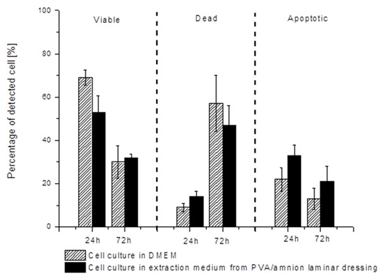 According to the obtained results, the percentage of the viable, dead, and apoptotic cells after 24 h and 72 h of cell culture did not differ significantly as compared to the control. After 24 h of cell culture, a certain percentage of dead and apoptotic cells could be detected. The amount of these cells increased as the cell culture time increased. This preliminary research indicates that the PVA/amnion laminated dressing has no significant detrimental effect on skin cells, mainly for the shorter culture times. Further biological studies of cells cultured in the presence of PVA/amnion laminar dressing, e.g., genotoxicity, are obligatory and forthcoming, but in this study, our intention was to show the potential of the obtained dressing for wound healing, at least as a short-term material.
