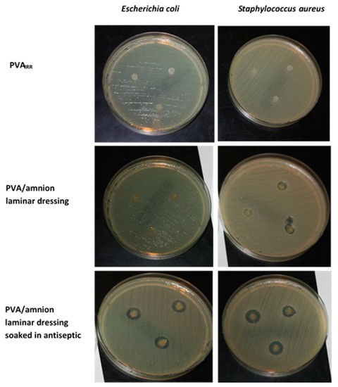 The antibacterial activity of the laminar dressing was investigated through inhibition zones. As the cryogel and the amnion itself possess absorbent properties, they can be used as a carrier of, for example, antiseptics for the treatment of infected wounds. Based on our own experience, as an antiseptic, we have chosen Sutrisept. Soaking the PVA/amnion laminar dressing in the antiseptic did not change its structure and morphology for one week at least (data not shown). The antibacterial activity of the dressings was studied for two strains of bacteria most often isolated from infected patients` burn wounds: the Gram-positive strain Staphylococcus aureus and the Gram-negative strain Escherichia coli. The obtained results are presented in Figure 8. The PVA/amnion dressings showed great absorption properties when soaked with the antiseptic. Such a prepared dressing inhibited bacterial growth. Based on the literature data [55], our clinical experience, and the studies presented in this article considering the growth inhibition zone, it can be concluded that the obtained PVA/amnion laminar dressing can prevent infections when used on uncontaminated wounds. In the case of infected wounds, the dressing can be soaked with antiseptic, leading to the efficient inhibition of bacterial growth.