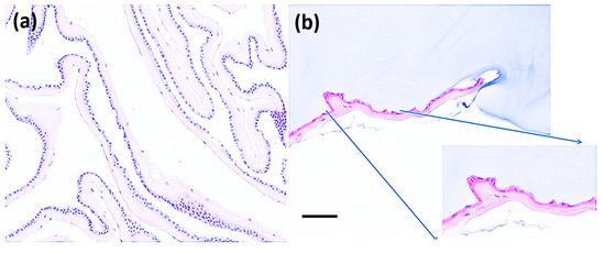 Results of (a) histological examination of amnion (magnification 10×) and (b) laminar dressing composed of amnion grafted to the cryogel (magnification 20×, space bar 200 μm; PVAIRR 10 wt%, 35 kGy).