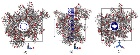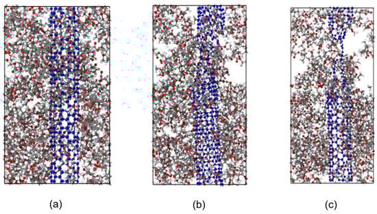 Using Equation (3), we computed the CNT volume percentage, which was 16.5%, 11.7%, and 8.1%, depending on the cell dimension of the x- and y-axis, which was 2.5 × 2.5 × 4.92 nm, 3 × 3 × 4.92 nm, and 3.5 × 3.5 × 4.92 nm. In this study, a constant density of 1.18 g/cm3 was used to pack 9, 12, and 14 polymer chains into the simulation box mentioned above [59].
