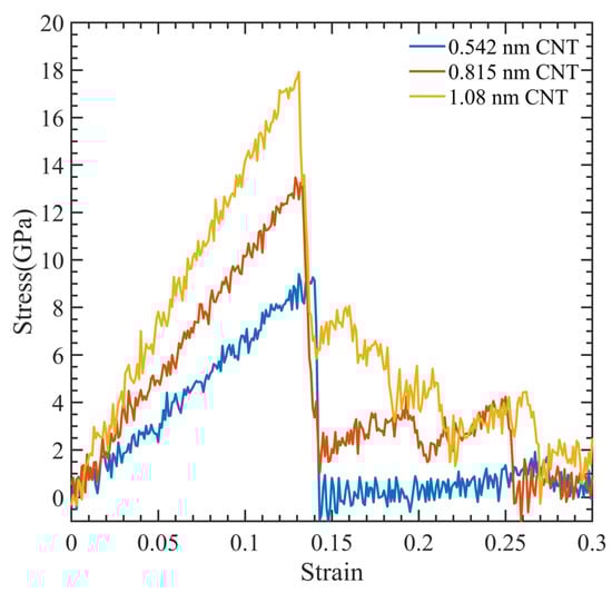 Figure 3 illustrates a stress–strain relationship, which enables the determination of ultimate tensile strength, ultimate tensile strain, and Young’s modulus. This relationship exhibits a brittle failure of the polymer matrix, and the final load-bearing capacity is due to the CNT fiber. Figure 4 displays the relationship between Young’s modulus and CNT radius. As the CNT diameter increases, an increase in Young’s modulus is observed, whereas the interaction energy of the system decreases. The relationship between the interaction energy and CNT diameter is determined by utilizing Equation (2).