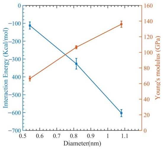 Figure 4. Change in interaction energy and Young’s modulus with respect to the diameter.