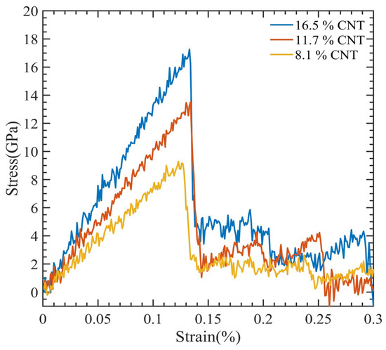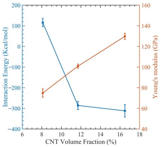 The outcomes are shown as a stress–strain graph in Figure 6. After obtaining values from the previous section, we generated Figure 7 to visualize the relationship between Young’s modulus and the interaction energy with respect to the CNT content. This figure revealed an upward trend in the composite Young modulus with an increasing CNT volume fraction, which is very comparable to the finding made by Yue et al. [17] in their investigation of the poly{(m-phenylenevinylene)-co-[(2,5-dioctoxy-p-phenylene) vinylene]}–CNT composite through MDs simulation. As the volume fraction of the CNT increases, the interaction energy between the CNT and PMMA decreases, since less polymer chains have the opportunity to interact with the CNT. This can be observed in Table 2.