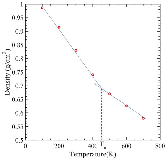 CNTs with a diameter of 0.815 nm and a constant length of 4.92 nm were used to study the impact of temperature variation. There were 12 polymer chains of PMMA packed into the same amorphous cell dimension used for the concept states. The simulation box was heated to one of the seven temperatures, 100 K, 200 K…, 700 K, to achieve equilibrium before tensile deformation was applied. The stress–strain relationship obtained from the MDs simulation data was used to determine the ultimate tensile strength, ultimate tensile strain, and Young’s modulus of the composite, as illustrated in Figure 8. In Figure 9, the relationship between interaction energy and Young’s modulus is depicted, and it shows that as the temperature increases, Young’s modulus increases, while the interaction energy decreases gradually, except for 400 and 500 K. Because the composite’s glass transition occurred in this range of temperatures between 400 and 500 K [59], where a glassy state transforms into a viscous state, interaction energy is drastically lowered at these temperatures. In our case, the glass transition temperature was 451 K, which can be seen in Figure 10, which is consistent with 468.8 K obtained from another MDs simulation of PMMA/CNT [59]. In the lower temperature range, both the polymer and nanocomposite exist in a glassy state, which transitions to a rubbery state as the temperature increases. This transition between the glassy and rubbery states is referred to as the glass transition temperature Tg. Another notable occurrence occurs at 700 K temperature when there is a significantly high value of interaction energy between the CNTs and PMMA due to strong bonding between them. This can be seen in Figure 11, where there is a distinct difference between the stable configuration of the CNT-PMMA composite at 100 and 700 K. The CNT can be seen in the composite’s xz plane which occurs due to the less densely packed PMMA chains at 700 K.