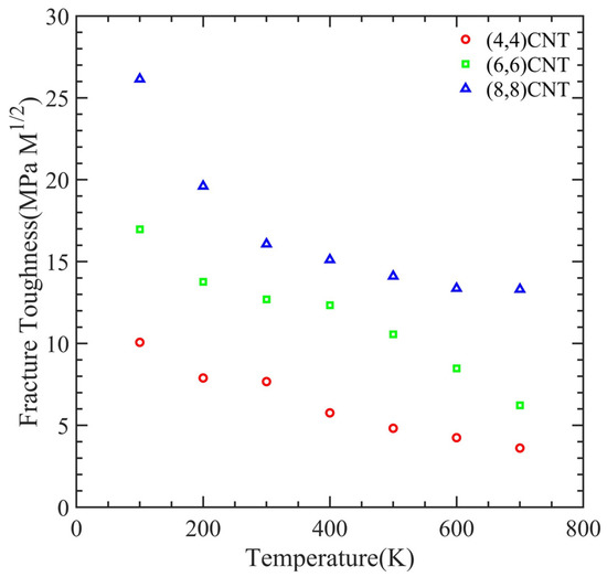 Figure 12 illustrates the dependence of fracture toughness on simulation temperature while varying the orientation of the CNT in a PMMA-CNT composite. Fracture toughness refers to the energy per unit volume that a material can withstand before it fails. We evaluated this value by calculating the area stress–strain curve. Our results show that the fracture toughness decreases with an increase in simulation temperature. Moreover, we observed that a higher orientation of the CNT leads to higher fracture toughness.