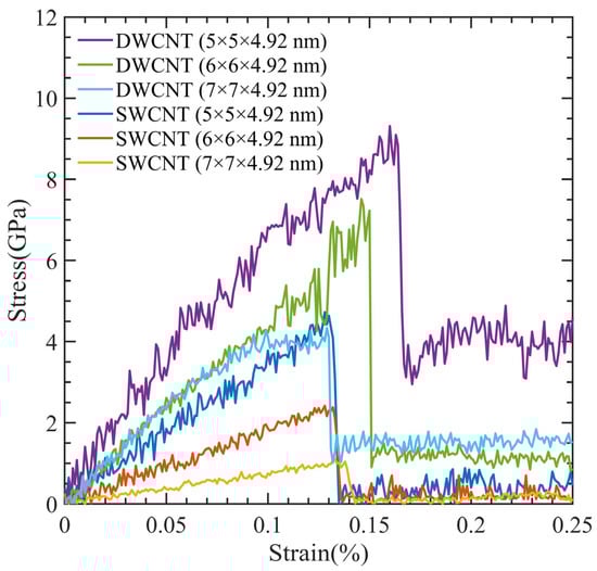Due to their exceptional characteristics, DWCNTs are commonly employed in applications that demand strong mechanical strength. Comparing the tensile strength of DWCNT (5 × 5 × 4.92 nm) and SWCNT (5 × 5 × 4.92 nm) models, Figure 13 shows that the DWCNT has double the tensile strength of the SWCNT. Apart from the number of CNT walls, these two models were essentially identical. The DWCNT models showed stronger strength and could resist higher strain percentages when we compared DWCNT (6 × 6 × 4.92 nm) and DWCNT (7 × 7 × 4.92 nm) models with their respective SWCNT models.