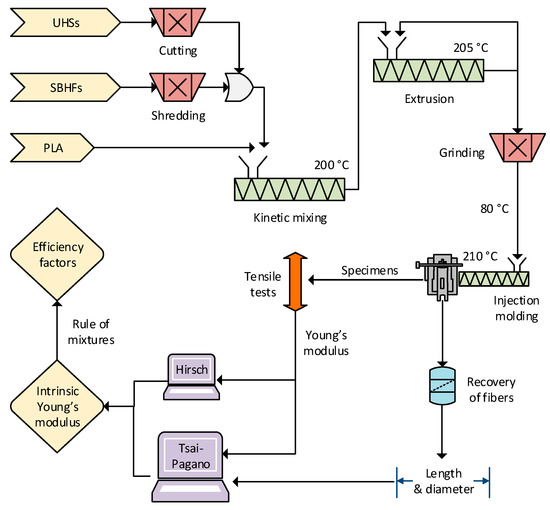 To produce the composites, PLA was mixed with 10 wt%, 20 wt%, and 30 wt% of either UHSs or BSHFs. The procedure is summarily schematized in Figure 1. For combinations, UHSs were cut down to lengths of 3.0 ± 0.3 mm, while SBHF dry pulp boards underwent fractionation using a paper shredder. In both cases, fibers were dispersed in the matrix using a Gelimat™ G5S kinetic mixer (Dusatec, Ramsey, NJ, USA). We set the angular speed at 2500 rpm, the discharge temperature at 200 °C, and the mixing time at 3 min. Then, the combined material was passed twice through a single-screw extruder, Eurotecno 3035 D (Eurotecno, Sant Fost de Camcentelles, Spain), with the screw rotating at 40 rpm. The temperature increased from 180 °C (hopper) to 205 °C (die). Finally, the extrudate was granulated in a hammer mill and stored at 80 °C for 24 h.