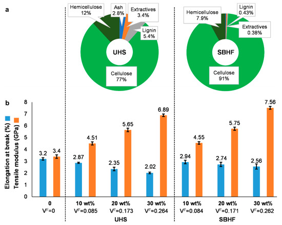 Experimental data (a) of the composition analysis and (b) of the tensile tests, encompassing Young’s modulus and strain at break (εtC), of PLA/UHS and PLA/SBHF biocomposites.