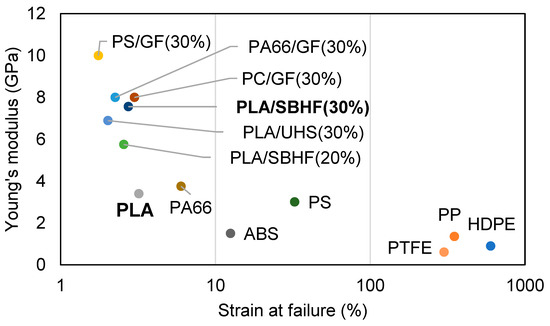 As a matrix, PLA is deemed a relatively stiff thermoplastic material, with a Young’s modulus of 3.4 GPa. For comparison purposes, it could be mentioned that the moduli of PP, high-density polyethylene (HDPE), polybutylene, poly(vinyl chloride), and acrylonitrile butadiene styrene (ABS) lie around 1.5 GPa, 0.8 GPa, 0.4 GPa, 2.8 GPa, and 2.3 GPa, respectively [44]. Figure 3 locates PLA and PLA/hemp composites in comparison with popular thermoplastic materials and GF-reinforced composites in which they constitute the matrix [45,46]. It should be noted that the indicative values displayed may belong to a broad range of possible values. In any case, the region at the right (high strain at failure) includes plausible choices for ductility design, while the upper region (high modulus of elasticity) includes materials for stiffness design.