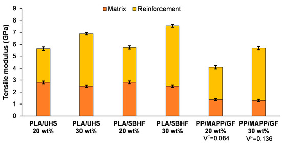 Figure 4 shows the contributions of the composite constituents, namely matrix and reinforcement fibers, to the Young’s modulus of PLA/UHS, PLA/SBHF, and PP/GF with maleic anhydride–grafted polypropylene (MAPP). Two levels of fiber load were selected for this comparison: 20 wt% and 30 wt%. Overall, due to the higher stiffness of the matrix (PLA vs. PP) [50,51], the tensile modulus of PLA/hemp was significantly higher than that of a more conventional PP/GF composite.
