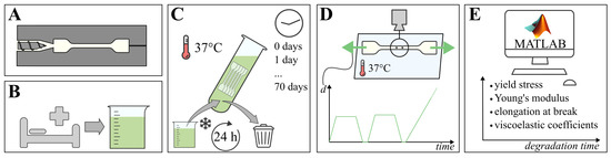 Schematic of the material testing procedure; (A) tensile testing samples of PCL and PLCL are injection molded, (B) fresh small intestinal fluids are collected, (C) samples are submerged for their respective degradation time at 37 °C, while fluids are refreshed every 24 h, (D) tensile testing by imposing displacement on samples while recording reaction force and visual data, (E) post-processing of recorded data using Matlab, resulting in mechanical material properties over degradation time.