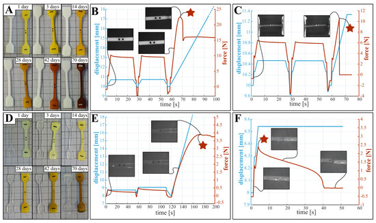 Observations made after degradation and during testing for PCL (top panes) and PLCL (bottom panes). The graphs show typical displacement- and force curves during tensile testing. (A,D) samples exhibited staining throughout degradation, without dimensional change. (B) Non-degraded PCL samples produce sharp high contrast images, and a well defined yield point as the samples show necking. (C) More degraded PCL samples (here 70 days) produced lower contrast images and display brittle fracture. (E) Non-degraded PLCL samples are partially transparent, producing low contrast images, without a clear yield point. (F) More degraded PLCL samples (here 56 days) display premature fracture, due to the appearance of multiple cracks in the reduced section. The locations of the considered yield points are indicated with a star.