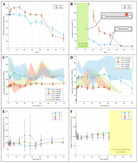 Graphs displaying change in mechanical properties of PCL and PLCL. (A,B) change in yield stress and elongation at break relative to initial value, (C,D) absolute values of elasticity modulus, based on optical data (shaded area) and based on encoder data (solid lines). (E,F) change of each viscoelastic parameter (see Equation (1)) relative to their initial, non-degraded, values.