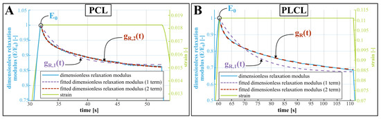Viscoelastic relaxation of a non-degraded PCL (A) and PLCL (B) sample, showing the dimensionless tensile modulus , where is the modulus at the onset of the stress relaxation. While the strain remains constant, the modulus decreases. This exponential decrease is fitted by the dimensionless relaxation modulus (Equation (1), using one term and two terms for comparison).