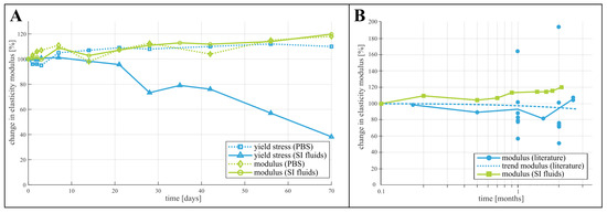 Comparison of the results with data from previous studies. (A) rate of change of yield stress and elasticity modulus of PCL in buffer solution (PBS) [20] versus small intestinal fluids and (B) comparison of data of the degradation of the elastic modulus from a literature review [3] and our results.