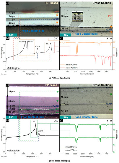 Packaging structure of PET (a1–c1)- and PP (a2–c2)-based MAP characterized by (a) light microscopy of film cross-sections, depicting the individual layers, (b) DSC (measurement of packaging film), revealing the melting peaks of the components, and (c) FT-IR spectroscopy (measurement of packaging film) for the identification of the inner (food contact) and outer layers. FT-IR and DSC curves of trays are provided in the Supplementary Materials (Figures S1–S4).