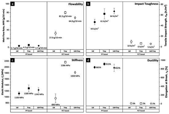 (a) Melt flow rate MFR [g/10 min], measured under a load of 2.16 kg at 220 °C (PP-based) and 275 °C (PET-based), (b) tensile impact strength atN [kJ/m2], (c) elastic modulus Et [MPa], and (d) elongation at break ɛb [%] of one-time recycled PP (solid markers)- and PET (hollow markers)-based post-consumer MAP divided into individual components (lid or tray) and entire packaging (lid + tray).