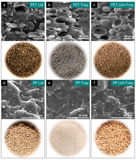 Samples of one-time recycled secondary materials and their morphologies, obtained from scanning electron microscopy of recycled (a–c) PET- and (d–f) PP-based post-consumer MAP divided into lids (a,d), trays (b,e), and lids + trays (c,f).