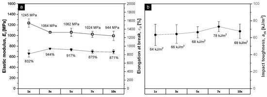 (a) Et (hollow markers) and ɛb (solid markers) from tensile testing and (b) atN from tensile impact testing (injection molded specimen) of 10 times recycled PP-based MAP (lid + tray). The x-axis marks the number of reprocessing cycles.
