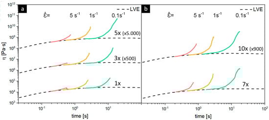 Vertically shifted extensional rheology curves of 10 times recycled (a,b) PP-based MAP (lid + tray) measured at 180 °C with strain rates of 5 s-1 (red lines), 1 s-1 (yellow lines), and 0.1 s-1 (green lines).