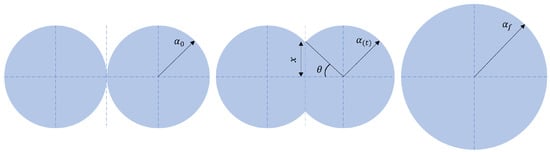 Schematic representation of the coalescence process. A droplet of radius coalesces with another droplet and ends with the radius . During the process, the particle radius and the angle of the intersection and the radius of the neck x change as a function of time t.