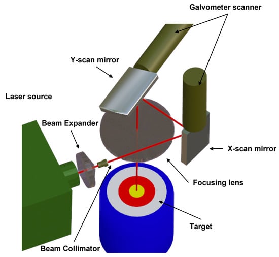 The laser beam is steered to the point of the powder bed to be sintered. This is performed by a galvanometer scanning technology that is coupled with a beam expander and beam collimator to control the energy density, the diameter and the spot size of the laser beam, see Figure 3. As a laser source, CO and Nd:YAG lasers are mainly used, but CO is usually preferred as it performs better in SLS systems. However, EOS has recently designed the CO laser beam that we used, which seems to have a smaller light spot, higher processing efficiency, and larger processing range. The laser used irradiates the powder with a radial Gaussian distribution. Xin et al. [] introduced a ray-tracing model that considers the attenuation of the laser energy in the powder bed, which can be described as a series of scattering effects. In this way, under the assumption of spherical particles, they found a strong dependency of the scattering on the distribution of the laser energy, resulting in variations of the temperature in different grains. Thus, as found experimentally also [], there is a correlation between the angle of incidence and the laser irradiance and thus the sintering performance.