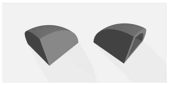 The material used for printing was PA11 (PA1101) white. It has a glass temperature of 46 C and a melting temperature of 201 C. However, after 180 C the material starts absorbing energy endothermically (enthalpy of fusion) and the deflection pressure is minimal at 0.45 MPa. For this reason, the chamber and the powder bed are heated to 176 C and 175 C, respectively, in order to increase flowability, favour the first layer to stick to the powder bed and reduce stresses, including warpage. We note that, according to Tey et al. [], PA11 has bimodal endothermic peaks for SLS systems, with the melting peak for the sintered part being the initial peak. This is due to larger unmelted powder particle cores that remained in the printed part due to insufficient heating. The removal chamber is kept at 160 C. Since we focused on the optimization of the part from an appearance perspective, two samples were designed with two different build setups for a quarter of a hemisphere with a radius of 20 mm: one solid (i.e., full) quarter hemisphere (Figure 4, left), and one hollowed on one side, creating thin walls of 2.5 mm (Figure 4, right). We selected thin walls of 2.5 mm as oversintering was observed locally for thinner features resulting in unsatisfactory surface quality. We wanted to test whether this phenomenon is partially still present with walls of 2.5 mm.
