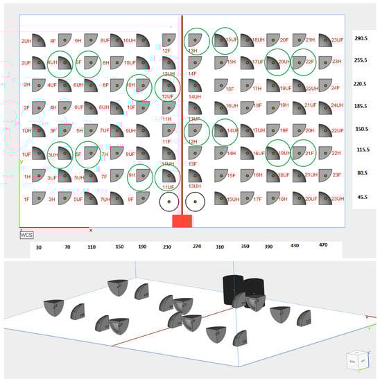 The samples were printed with the top edge of the part (Figure 4) towards the bed (direct-build setup) or pointing to the top of the machine (inverse-build setup). The quarter hemisphere part has three identical edges; therefore, in order to distinguish between them, we marked them with alphanumeric characters and oriented them on the left side of the machine (Figure 4). They were marked with an F for full, an H for hollowed and a U for inverse build setup (i.e., upside down). The printable volume measured 330 × 500 × 400 mm, so we requested a print job with 94 samples as in Figure 5.
