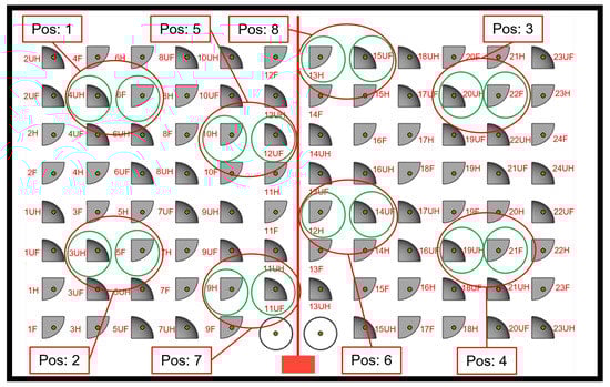 Numbers assigned to different positions in the powder bed for the pos factor in our factorial design. The red letter codes for the parts reveal their values for the build setup factor bus (U or not) and the design factor fuh (F or H).