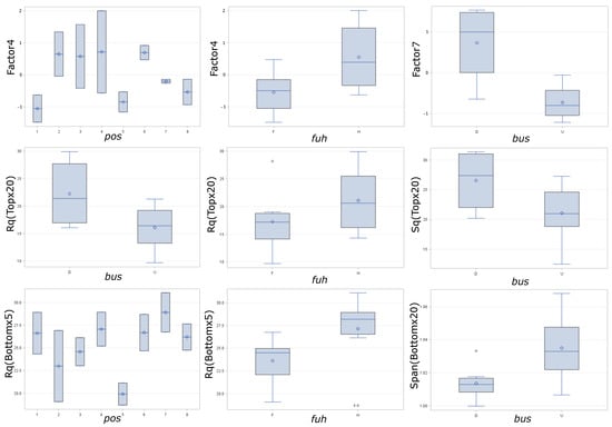 With ANOVA we can say that our results are statistically significant, but we do not know exactly where the differences lie. For this reason, we apply a multiple comparison test, in particular Tukey’s HSD (honest significant difference), to find out which specific groups (compared with each other) are different. With Tukey’s HSD, we compare the largest sample mean with the smallest one. If we find a significant difference between the means, the test proceeds to greater sample means until the difference is non-significant. The main results of our multiple comparison test are listed in Table 4. By inspecting the boxplots of the variables with significantly different means for the different model input parameters (explanatory variables: pos, bus, fuh), the nature of the difference in the means becomes clear in some cases. Boxplots with a clear interpretation are shown in Figure 7.