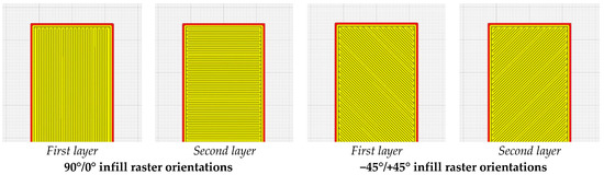 The STL models were processed (slicing) using Cura 5.3.0 software (UltiMaker, a free processing software, Utrecht, the Netherlands). To prevent the clogging of the nozzle and to lower the time required to manufacture a specimen, a height of 0.36 mm was used in slicing the model with a first layer of 0.2 mm in height. The values selected were in the recommended range of 25–75% of the diameter of the nozzle. The resulting G-code was inserted into the machine computer. All specimens were designed as framed configurations (2-frame layers) with full infills and two different raster orientations, 90°/0° and −45°/+45°, as can be observed in the images in Figure 1.