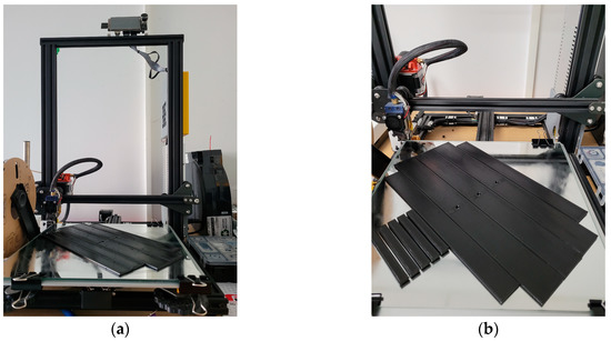Images during the specimens’ manufacturing process: (a) overall image with the 3D printer; (b) specimen during the manufacturing process.