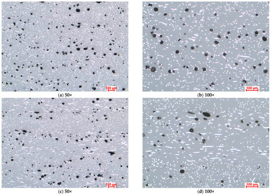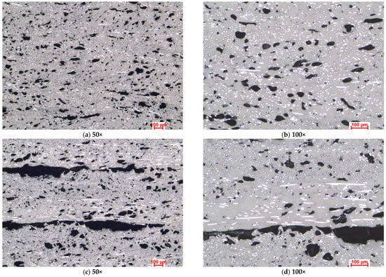 Figure 3, Figure 4 and Figure 5 present the optical microstructures of the samples manufactured with Tough PLA, nGen CF10 (colorFabb, Belfeld, The Netherlands) and UltraFuse PAHT CF15 (BASF, Emmen, The Netherlands) at 50× and 100× magnifications for the two raster orientations of 90°/0° and +45°/−45°, respectively. In these images, pores were visible as black areas with various geometries, while carbon fibers were visible as luminous white spots and lines. The thermoplastic polymeric matrix was grey regardless of the material used.