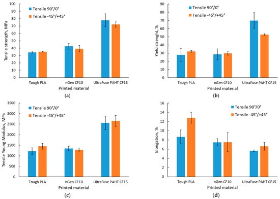Histograms with the average results of the tensile tests for all material batches and raster orientations are presented in Figure 6.