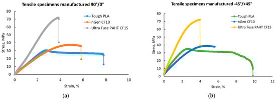 An increase in the tensile strength and elastic modulus simultaneously with a decrease in toughness and ductility with the addition of carbon fibers to polymers was recorded. Moreover, Tough PLA had a more ductile behavior, with higher elongation values regardless of the raster orientation, as can be observed in Figure 7a,b, where a comparison between the stress–strain curves of the materials and raster orientations tested is presented. This behavior was consistent with the findings of other authors [20,21,23].