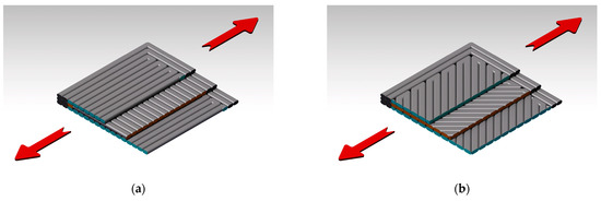 Tensile force direction during the testing of the two configurations: (a) 90°/0° raster orientation; (b) −45°/+45° raster orientation.