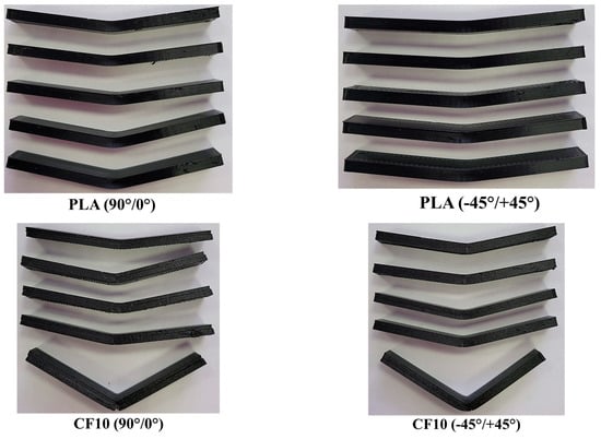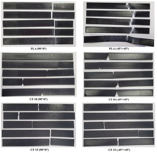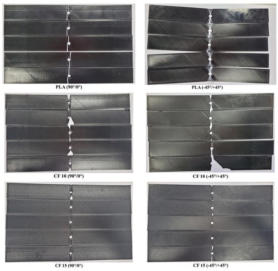Figure 17 presents images of the tested specimen batches. The elastic behavior was observed in the case of the Tough PLA specimens, especially for specimens manufactured using a −45°/+45° raster orientation, where they bent during the tests and then returned to their approximate original form afterwards, as can be observed in the images in Figure 17. A complete rupture occurred on the UltraFuse PAHT CF 15 specimens. Similar damage was observed for UltraFuse PAHT CF15 by Tutar [23].