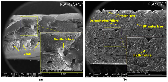 The SEM images of the Tough PLA specimens with a raster orientation of −45°/+45° shown in Figure 10a indicated a predominantly ductile fracture mode and an irregular fracture surface. Despite using the same material and printing conditions, the Tough PLA specimens with a raster orientation of 90°/0° exhibited less ductile behavior compared to the −45°/+45° batch and a uniform fracture surface. This difference in behavior could be attributed to the direction of the applied force during testing, as illustrated in the schematic representation in Figure 8; its impact was also reflected in the variations in tensile properties.
