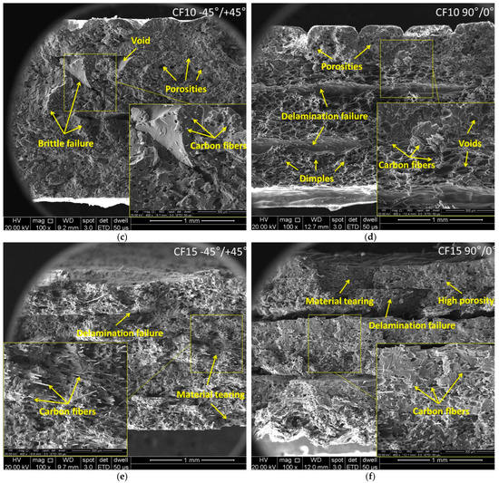 Representative SEM images of fractured surfaces from Tough PLA, nGen CF10 and UltraFuse PAHT CF15 specimens with −45°/+45° and 90°/0° raster orientations: (a,b) Tough PLA, (c,d) nGen CF 10 and (e,f) UltraFuse PAHT CF15.