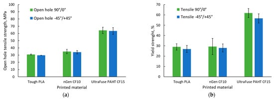 Comparing the average tensile strength with the average open-hole tensile strength showed that a reduction in the materials’ strength was registered for all materials, although to different extents, as can be observed in Table 5.