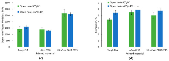 All specimens were damaged according to a standard fracture initiated from the hole area; thereby, no specimen was excluded from analysis. Similar to the tensile tests, the open-hole tensile tests revealed that the highest strength was ensured by the UltraFuse PAHT CF15 material. In this case, we observed that in terms of the strength and elastic modulus, the values recorded were similar regardless of the raster orientation; it seemed that integrating a hole in the middle of the specimen diminished the influence of the raster orientation.