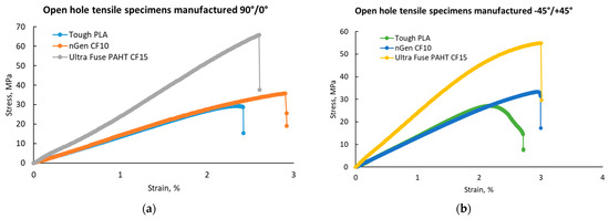 Representative stress-strain curves for the open-hole tensile test batches: (a) with 90°/0° raster orientation; (b) with −45°/+45° raster orientation.