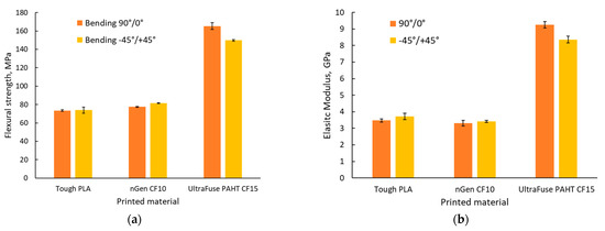 Studying the materials’ datasheets [36,37,38], we observed that Tough PLA and nGen CF 10 had no information regarding the flexural properties of the materials, but it was provided for UltraFuse PAHT CF15. The results obtained for the flexural properties of UltraFuse PAHT CF15 were similar to those provided in the datasheet for the flexural strength and elastic modulus, regardless of the raster orientation; but, here, we obtained higher elongations at the break.