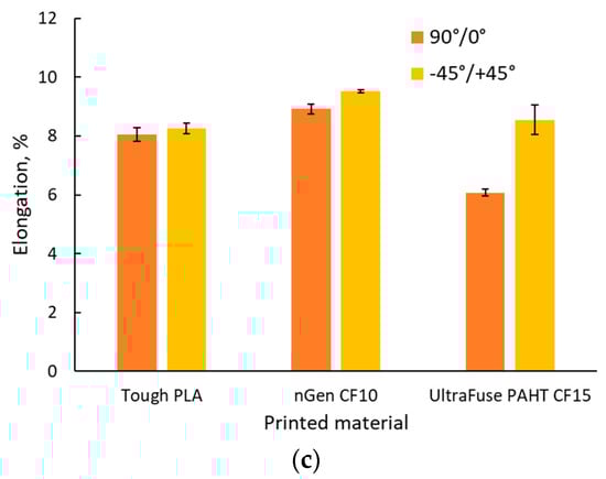 In the case of the UltraFuse PAHT CF15 specimens, the voids formed during printing acted as sites for crack nucleation, which, ultimately, led to severe delamination between the layers, as shown in Figure 10f. Despite the delamination, these specimens exhibited the highest mechanical strength, particularly when the 90°/0° raster orientation was used. The results indicated that specimens built with the 90°/0° raster orientation demonstrated higher values of tensile strength and elastic modulus while maintaining similar elongation values compared to the −45°/+45° batch.