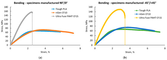 Representative stress–strain curves for the three point bending test batches: (a) with 90°/0° raster orientation; (b) with −45°/+45° raster orientation.